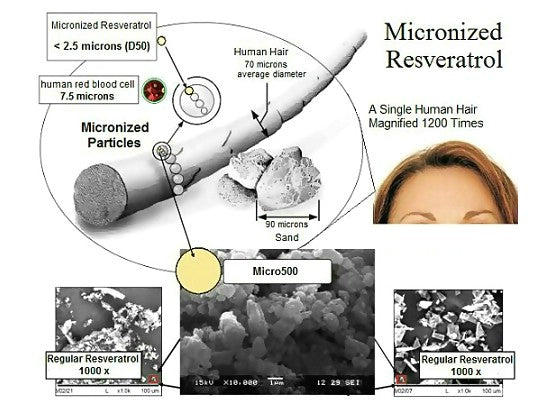 Micronized resveratrol is small enough to pass through the tiny mucous membranes, and has properties that normal resveratrol does not. A particle size between 1 - 4 microns is smaller than what most water filters can stop. One micron is 100 times smaller than the width of a human hair, and easily absorbed by your body.